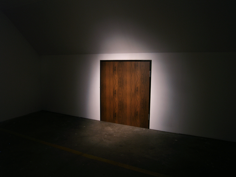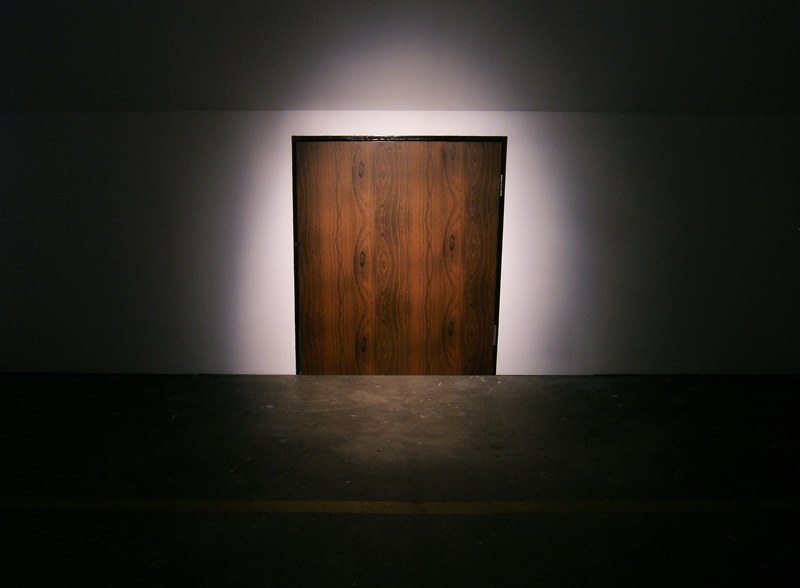 Installed in a gallery in the basement of an urban carpark, The Other Side sought to narrativize the specificities of that space, while blending traditionally opposing theatrical and minimalist tendencies. The narrative dimension physically compromised a false, low sloping ceiling and an undersized door covered in an uncannily artificial woodgrain vinyl. From behind the door came a persistent knocking, conjuring certain horror-film tropes but also more darkly absurdist overtones of the sort associated with the stories of Kafka or Beckett or more specifically, of Alfred Kubin, the macabre early 20th Century Viennese graphic artist and author whose novel the title of this installation paraphrases. More broadly, in a contemporary context, the work functioned as kind of frustrated promise whereby the ‘secret’ of the artwork, its ultimate ‘meaning’, was insistently and frustratingly withheld.