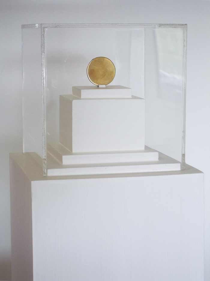 A self-referential auction work, ‘Summit’ symbolically crowns references to Malevich’s model for a constructed utopia, the ‘architekton’, with a triumphalist symbol of today’s most revered value. Literally de-faced though this supposedly universal value suggests itself to be ultimately representational and arbitrary.