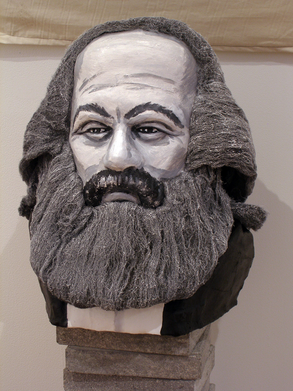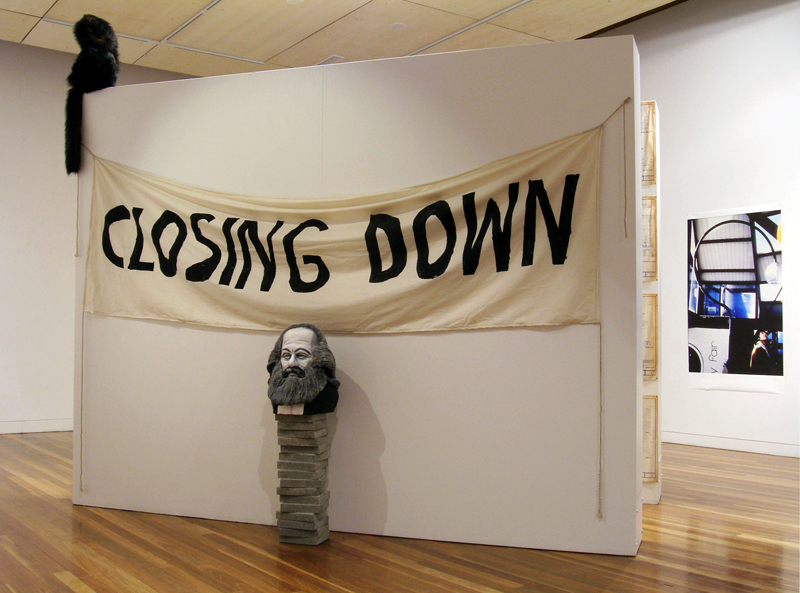 In this work Untitled (Capital)… Marx has ascended from the bottom of the pile to the top while still unable to escape the rubble of history, the stack of blank concrete ‘tomes’ upon which he is perched. Here an approximation of the iconic once mass-produced, bust of the Marx appears as a type of cipher; a hand-made ‘folk icon’ suggesting Marx’s re-emergence in the present. Certainly the contemporary ‘sketch’ of his image is proving particularly compelling for those previously unexposed to the extent of his critique. Yet what is the place of Marx in art? Obviously the answer to this question remains, and must remain, ambiguous and insoluble. Certainly there is no such thing as ‘Marxist art’ that could be genuinely named as such. Nonetheless, there are practices capable of an awareness of Marxist legacies that perceive a greater role for art other than as inventive decoration or convenient capitalist spectacle.