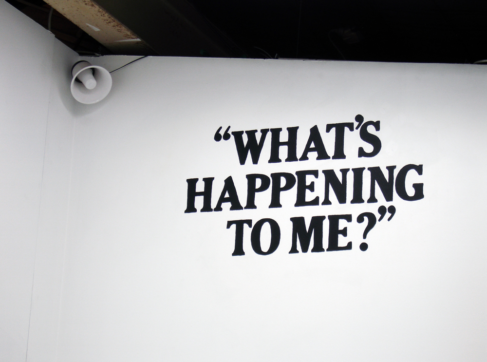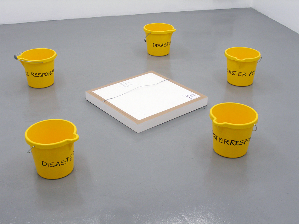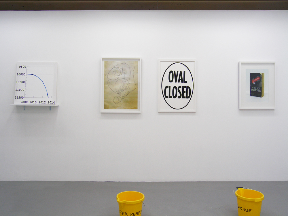 This installation consisted of a series of works self-consciously parodying the exhibition format as a locus for competitive anxiety. The work overlayed a sense of hyperbolic adolescent angst over the exhibition context, blending references to exacerbated sexual and artistic competition. For example, through a peep-hole in the gallery wall a production of Wagner’s ‘Tristan and Isolde’ (1865) featuring stereotypical overweight Wagnerian singers, could be glimpsed. This otherwise silent video was here subtitled with a text taken from an episode of a popular television show lampooning amateur contemporary art collecting. Thus, a paradigmatically libidinous operatic text was conjoined with an equally libidinous, and ultimately misinformed, text about the drive to ‘legitimate’ cultural accumulation. Meanwhile, from four corners of the gallery space loudspeakers intermittently blasted the famous penultimate Liebestod (or ‘love-death’) from the Wagner opera. However, this ‘sublime’ aria was played on tinny electronic instruments further contributing to a combined sense of anxiety, irritation and humour. At the same time, the mock-tragedy of the work seemed to principally revolve around a dropped artwork that lay smashed face down in the middle of the gallery space.