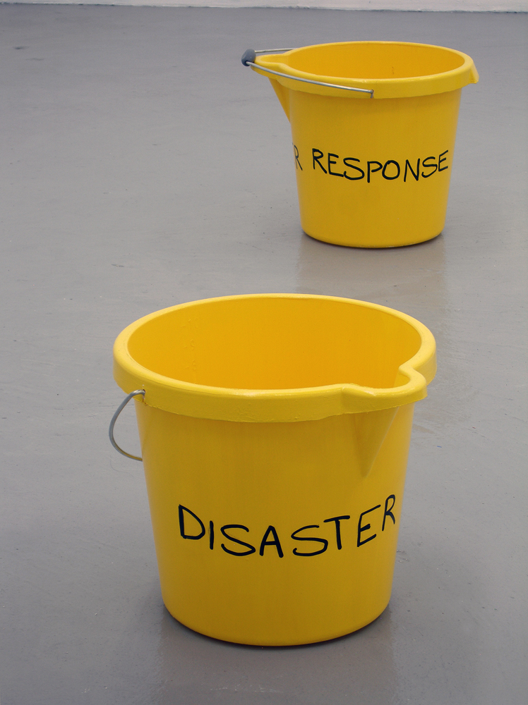 (Enamel paint, acrylic, timber, masonite, cardboard, painted plastic buckets, perspex, permanent marker, wire, 4 x speaker horns + sound, digital video, digital photo frame, tripod)