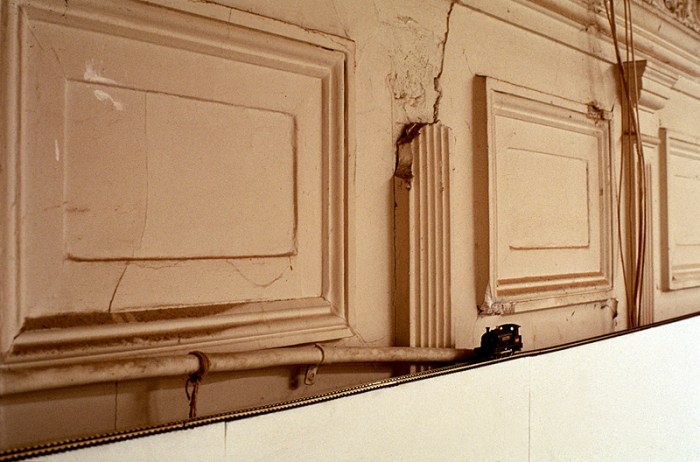 A replica engine perpetually cycles around a circular track attached to the very top edge of the gallery walls. As a result, the gallery space becomes a resonating chamber with the locomotive now ‘playing’ the gallery. Rather than a mere narrative presentation, the mini-engine circling the room instead transforms the gallery into a kind of machine. The empty, but otherwise heavily encoded site, is activated in the process of its presentation as art.