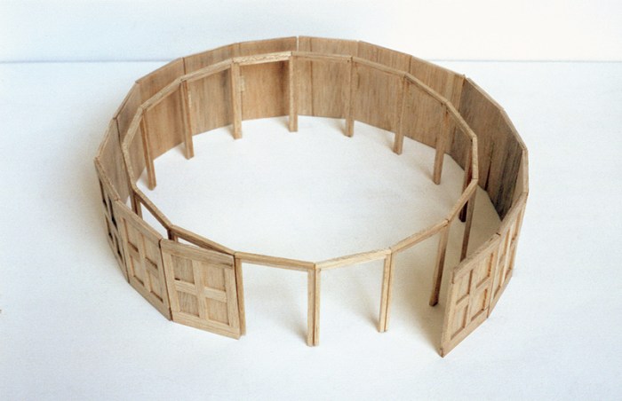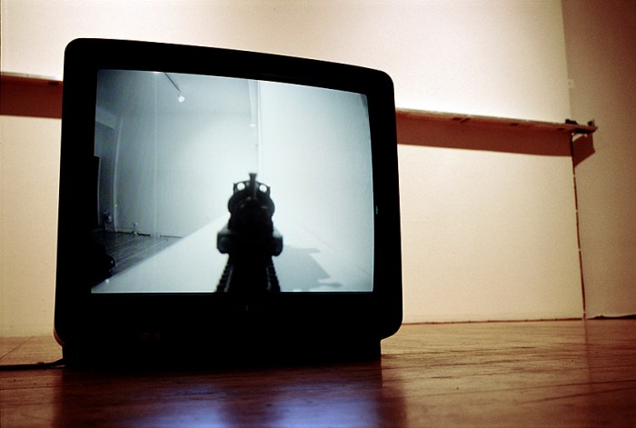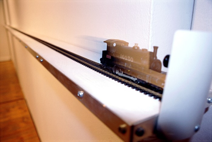 The work cites the historic interconnection between the contraction of space resulting from the advent of high-speed travel and the similar contraction of time enacted via the cinema. The installation specifically references the Lumiere brothers’ 1896 film, ‘L’arrivée d’un train à La Ciotat’ that famously cleared cinemas when it was first shown as audiences attempted to flee their (virtual) deaths, the train speeding apparently straight at them. In terms of this piece, the video image of the replica engine speeding towards the miniature camera functions ultimately as a decoy for an external audience who remain fixated with the virtuality of televisual motion over and above its physical source. No longer fear-inducing, the advent of digitization and its attendant miniaturization has meant that space has become progressively compressed and the illusion of reality predominant.