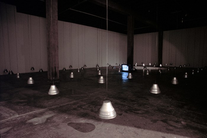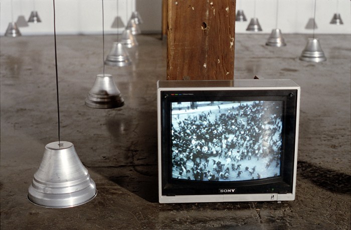 (60 x speakers + aluminium housings, speaker cable, cassette deck + loop tape – crowd cheering – amplifier, video monitor, VHS player + video loop – thronging crowd from ‘October’ by Sergei Eisenstein)