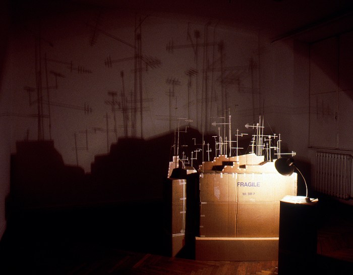 (Cardboard, balsa wood, cotton thread, masking tape, electric lamp)