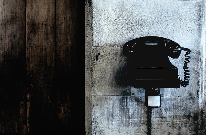 (Bakelite telephone, MDF, enamel paint, sensor, Walkman, cassette loop)
