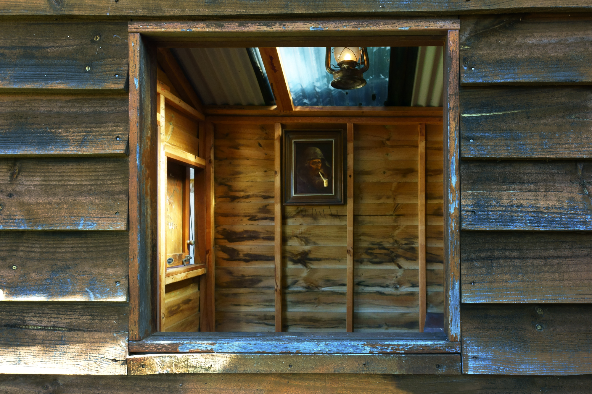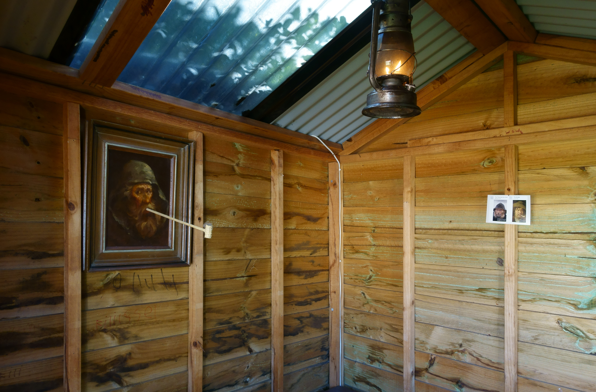 (Found painting, aluminium and plastic tubing, acrylic paint, atomiser, amp, speakers, CD player, hurricane lamp, lamp oil, postcard)
