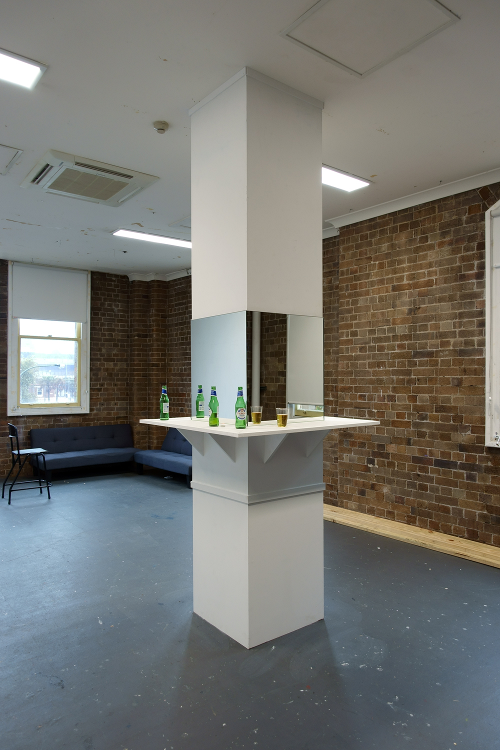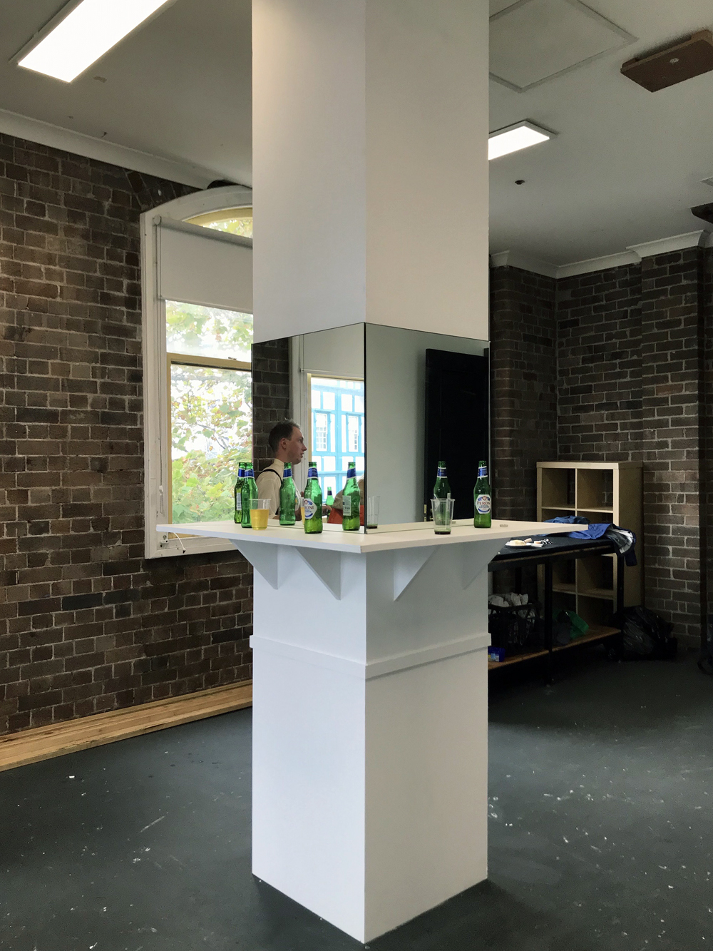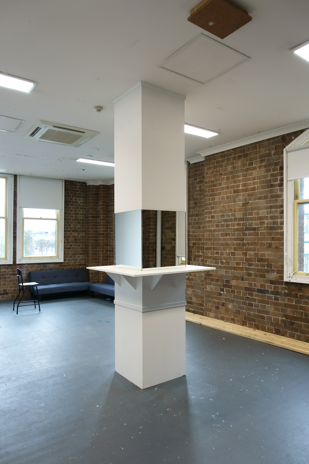 A parasitic architectural intervention inspired by an example from a local shopping mall. The work is designed to disappear within the studio context to become part of the surrounding architecture. At the same time, the work appears uncannily off-kilter within the studio situation: it belongs and doesn’t belong. The work complicates the assumption of sculpture’s commodifiability (as much as absolutely anything can potentially be turned into a commodity) by becoming intrinsically, inextricably wedded to the space. The emphasis now, amplified by the use of 360° mirrors, is the studio space itself and what occurs within it during an opening. Normally, the studio is distinctly, even uniquely, separated from the public sphere. ‘The world around us’ as artists is often an interior space, whether it’s a studio, office or some other type of introspective arena in which work is produced and object-orientated thinking occurs. Deflecting outwards onto the experience of the one-day-only opening, the piece emphasises that art is never autonomous in the sense of its aesthetic isolation, which at the same time is traditionally its most commodifiable aspect. And in that sense, the ‘function’ of the studio, while being private, is not too different from the predominant focus of the shopping centre – selling things. Of course, this is a simplification. But don’t shopping malls equally define their own type of functionally determined artless art? Moreover, the cheapness of the generic shopping experience (no matter how expensive it ends up) is nonetheless related in global terms, to the mass sale and circulation of elite aesthetic commodities commonly known as art. Only the artworld, regardless of how crassly commercial it has become by now at least within its upper echelons, will forever decry its absolute distinction from ‘base commerce’. Maybe Bordieu’s ‘commodity that isn’t one’ (ie. art) needs to rethink its own conditions, its own situation? Saying art is ‘just a commodity’ is clearly stupid. But in a global scenario beset by the obviously decimating idiocy of wall-to-wall financial capitalism, surely asking what else art is, or could become, is surely it’s real current challenge?