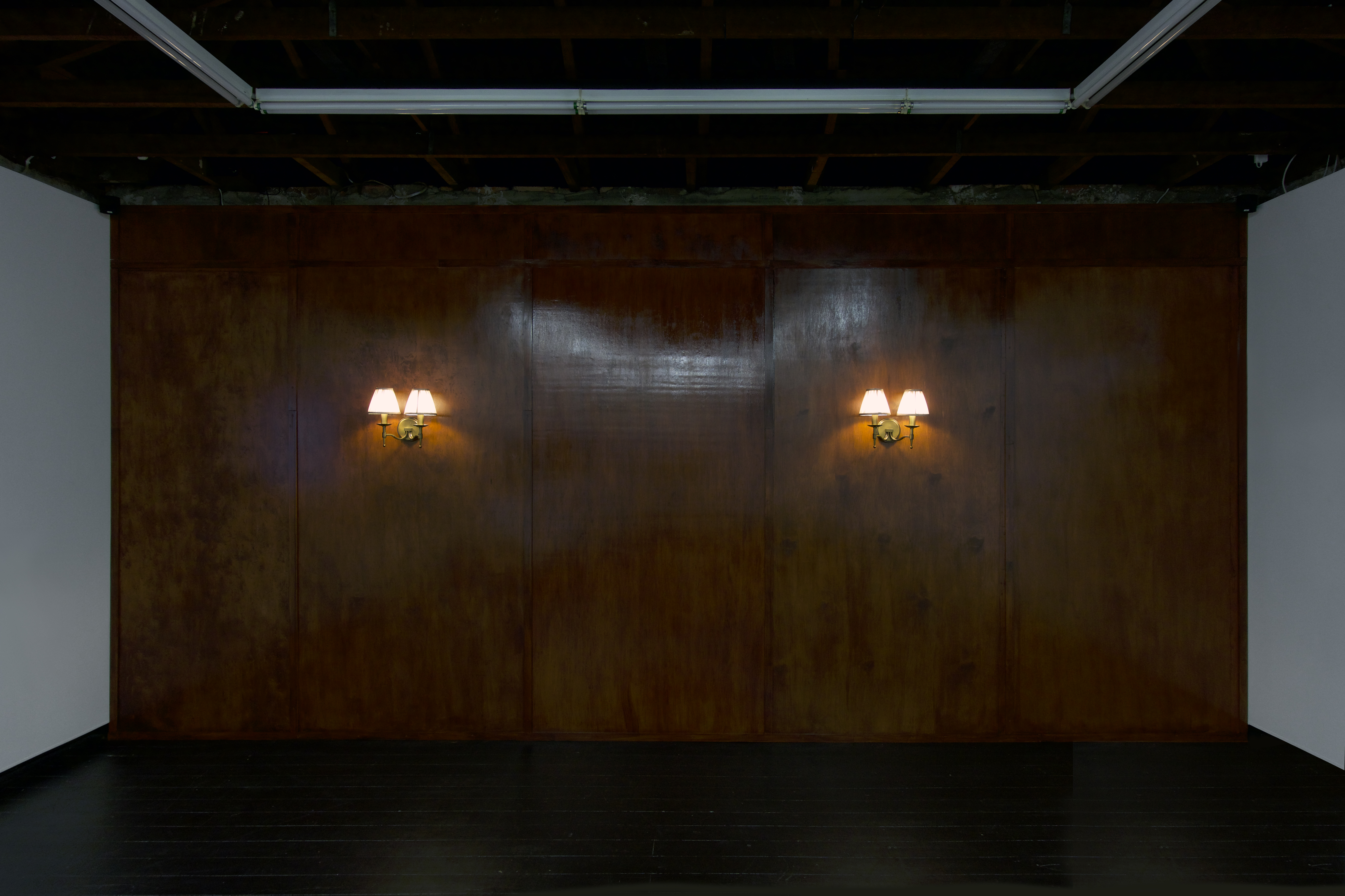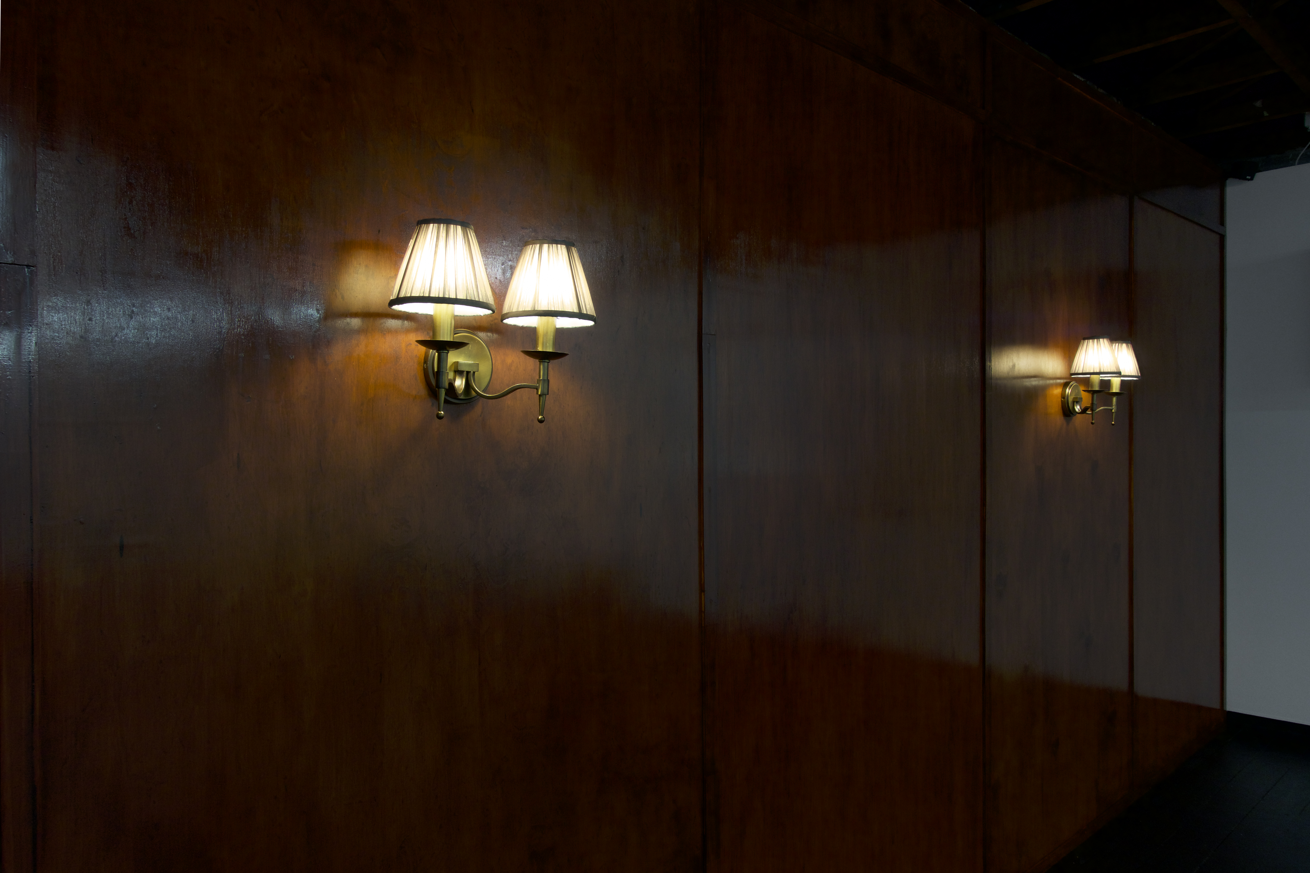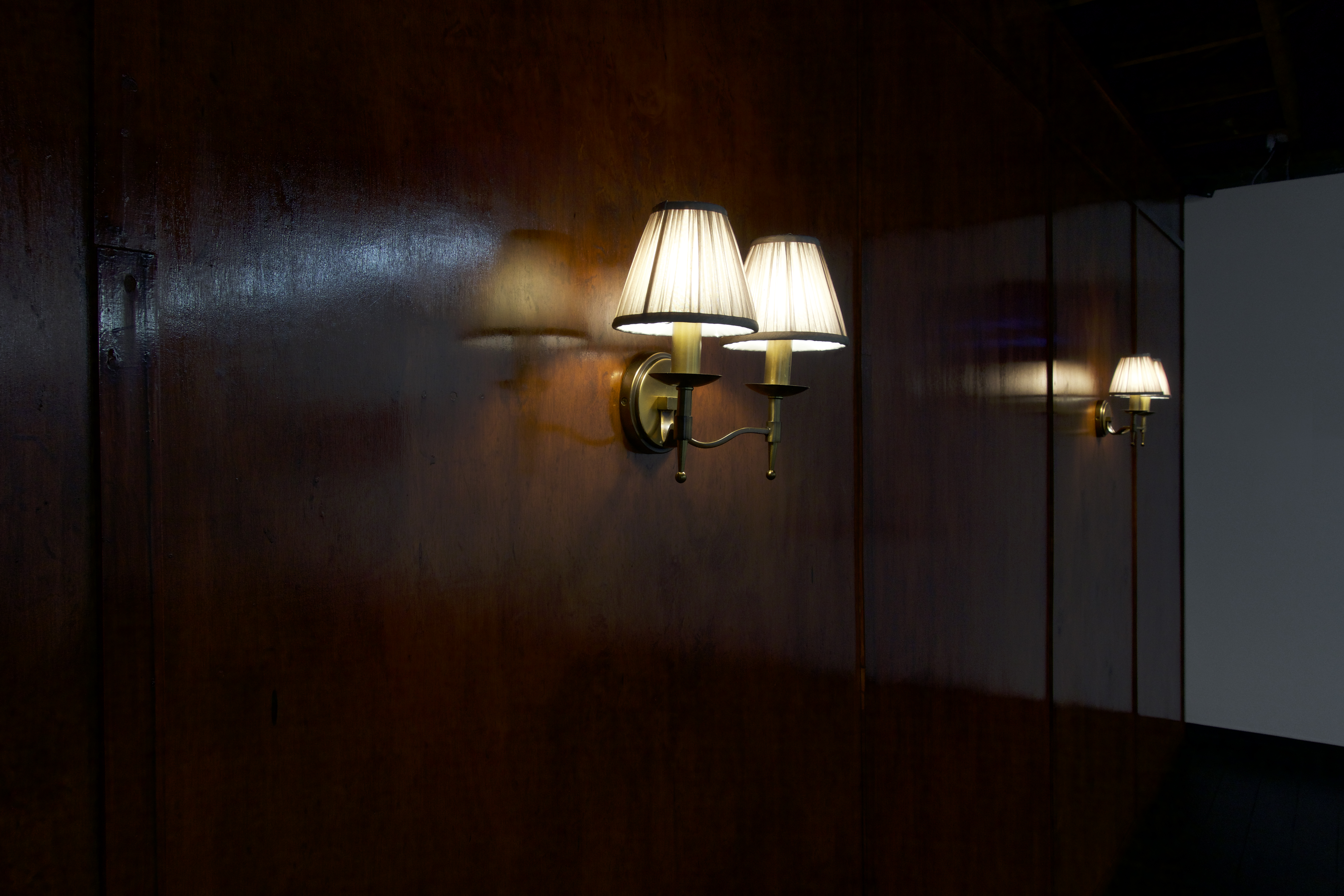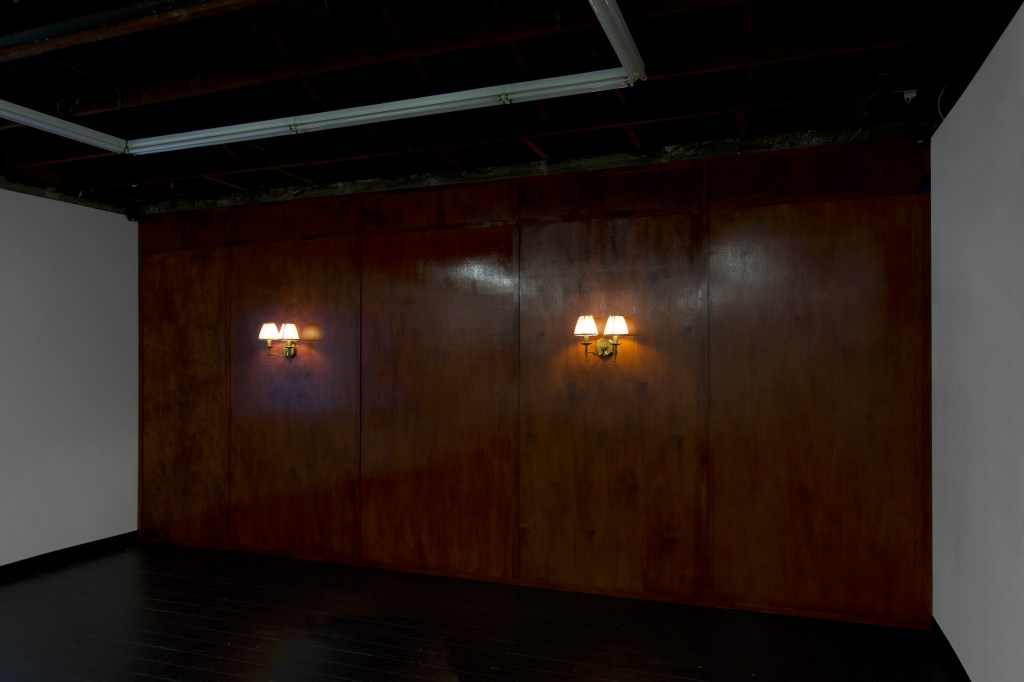 (Timber, ply, sconce lamps, speakers, amplifier, CD player, sound loop (slow synthetic waltz)).