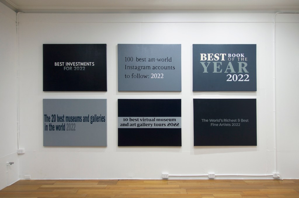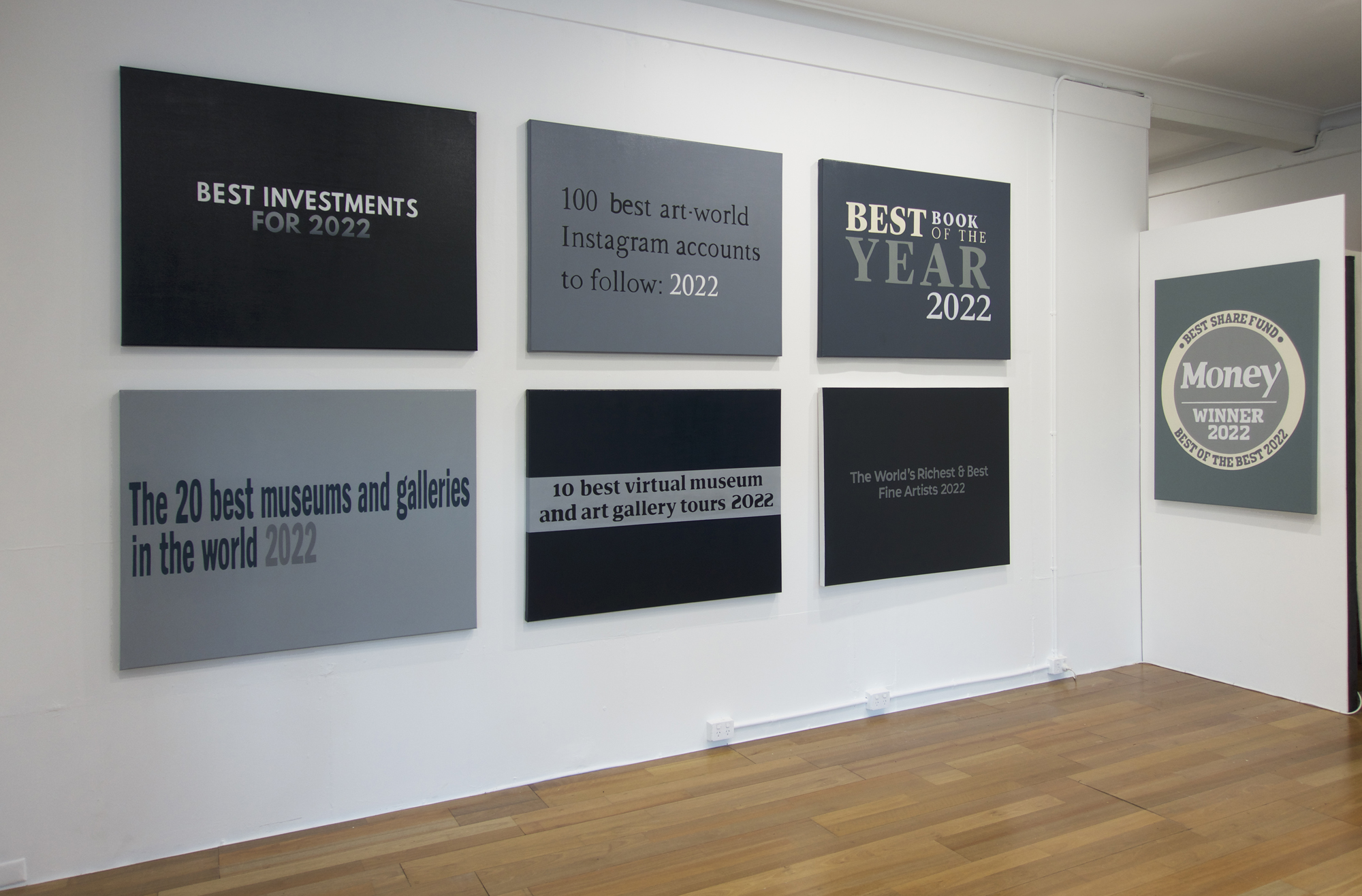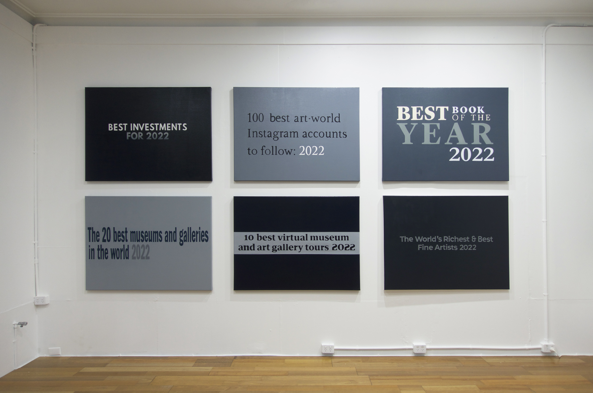 Filling the ‘sacred’ space of art with neoliberal dross then is a means of thinking outside art as a thing, and arena, in and of itself. These works faithfully reproduce the fantasies of self-entrepreneurial competition, ranking and quantification central to the degraded yet lingering neoliberal mindset. Tellingly, rather than outside art, this mindset clings to contemporary culture like a virus. This ensemble of paintings, ritually gifted gratis at the conclusion of the show, aimed to foreground the underlying instrumentalisation and constriction of art as a form of thinking, within a culture of privatization that pits all against all. In the absence of actual innocence, who ranks, and for whom?