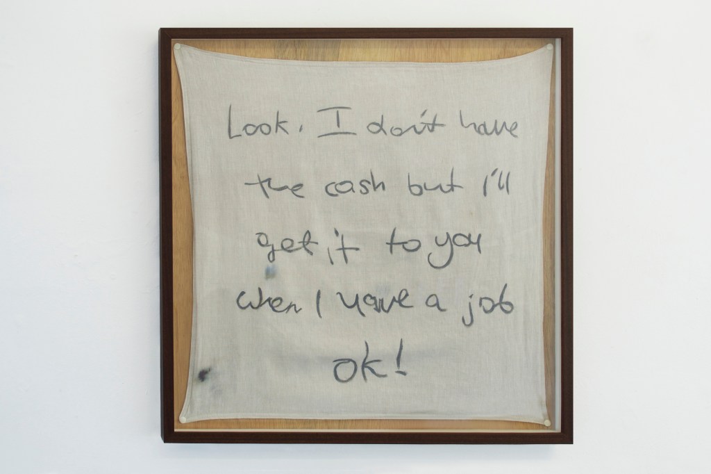 (Acrylic on stained linen cushion cover, plywood, framed – 910 x 910 x 35 mm)
