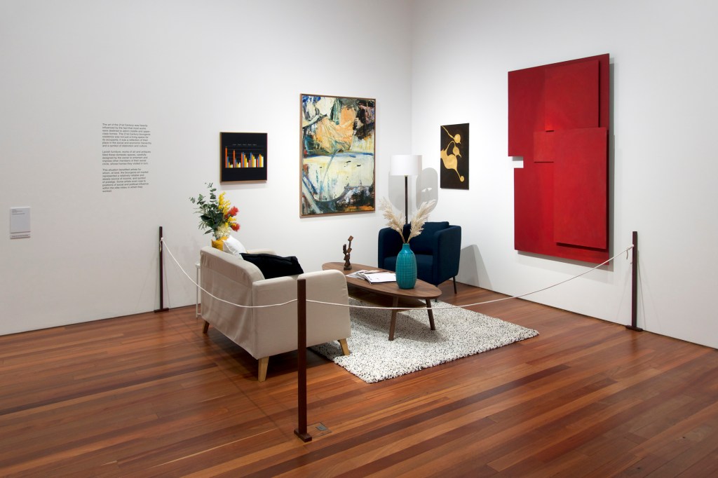 (Timber, MDF, paint, paper, cardboard, felt, photographic paper, frame, digital print on canvas, furniture, woolen rug, cushions, books, magazines, ceramic & glass vases, artificial flowers, vinyl lettering)