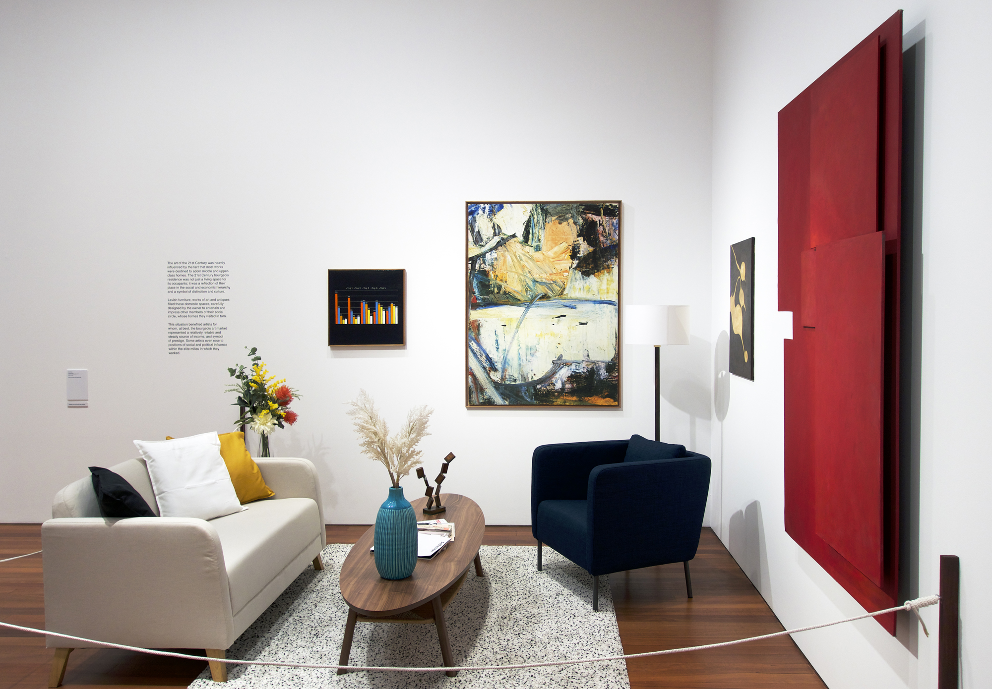 (Timber, MDF, paint, paper, cardboard, felt, photographic paper, frame, digital print on canvas, furniture, woolen rug, cushions, books, magazines, ceramic & glass vases, artificial flowers, vinyl lettering)