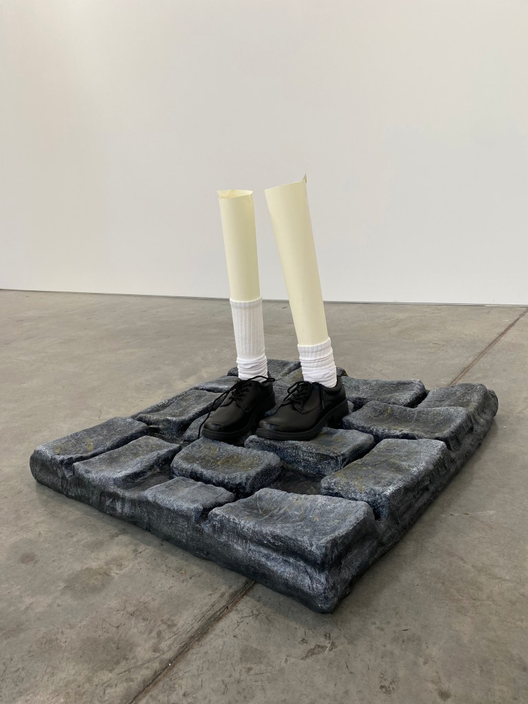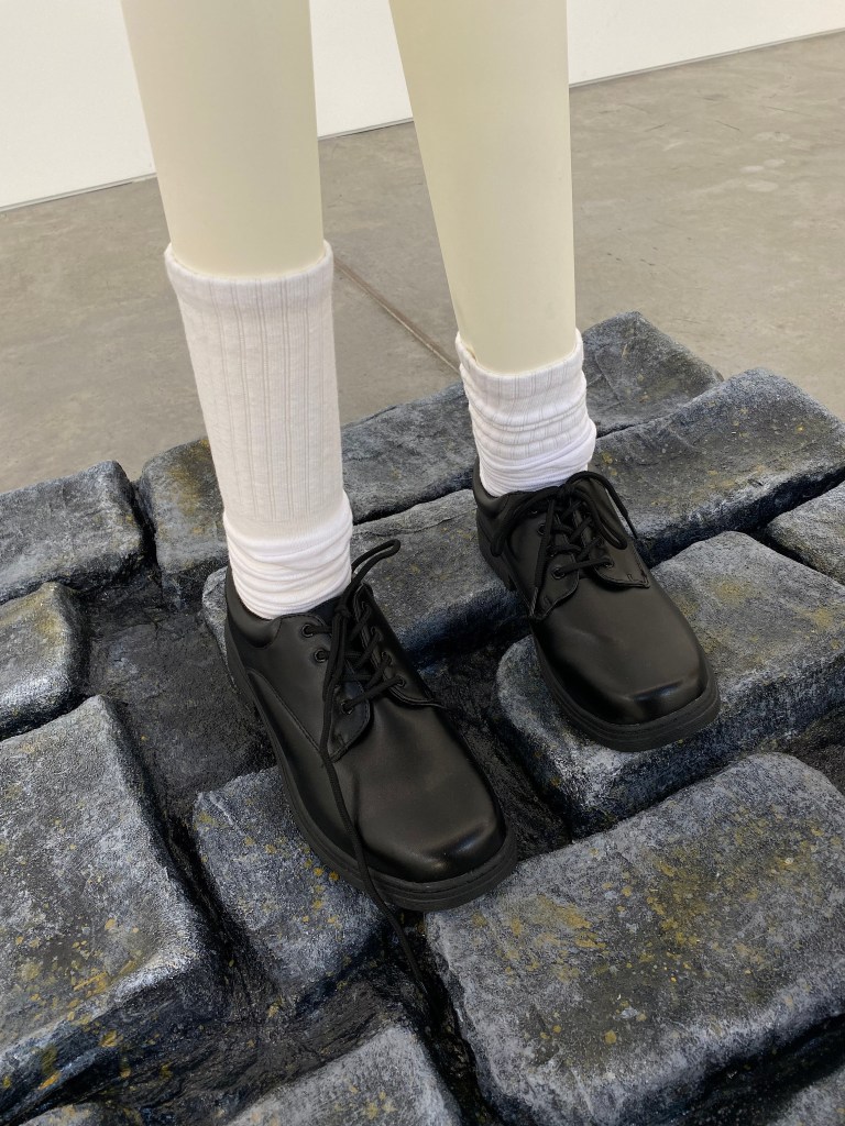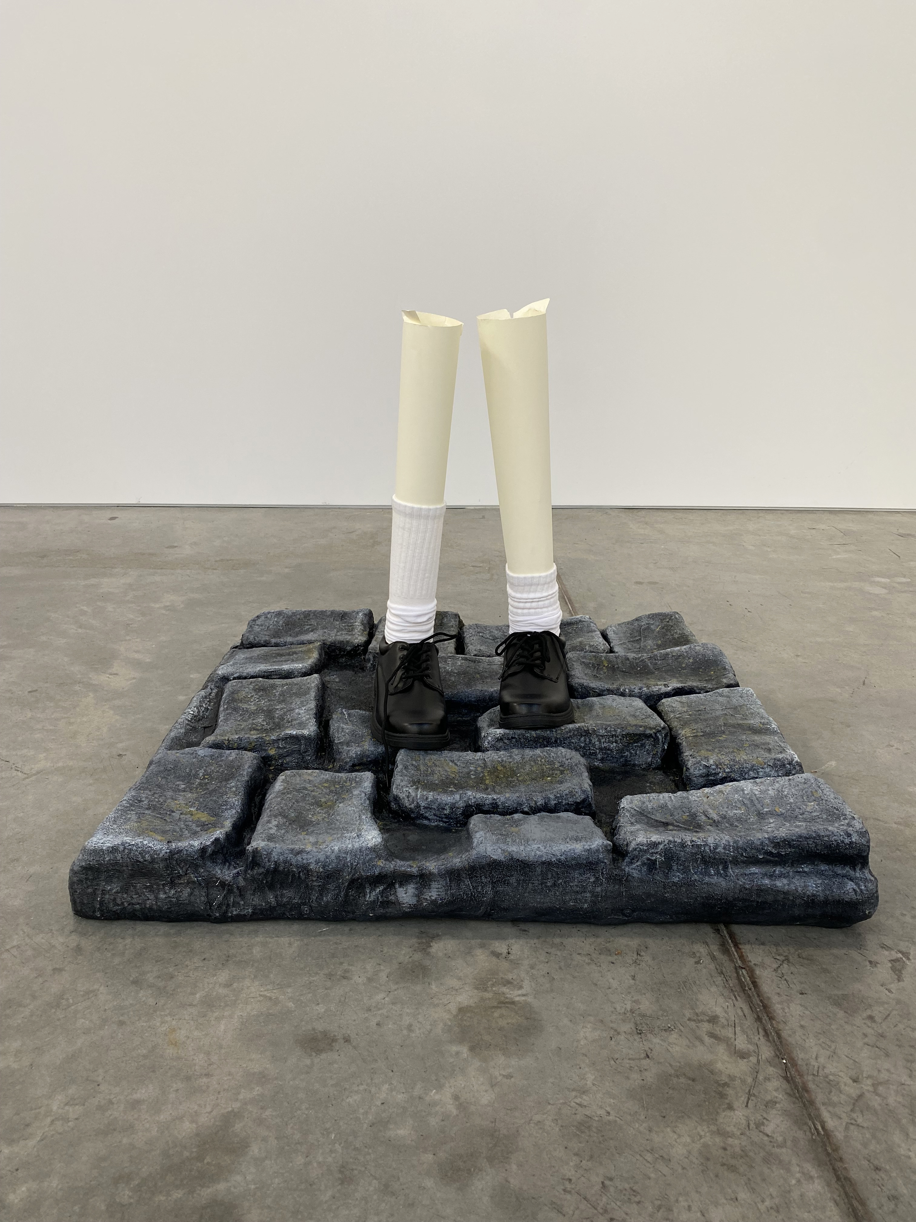 (Chicken wire, plaster, acrylic paint, resin, shoes, socks, cardboard, timber, bolts)
