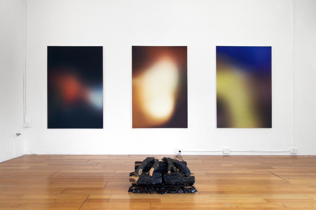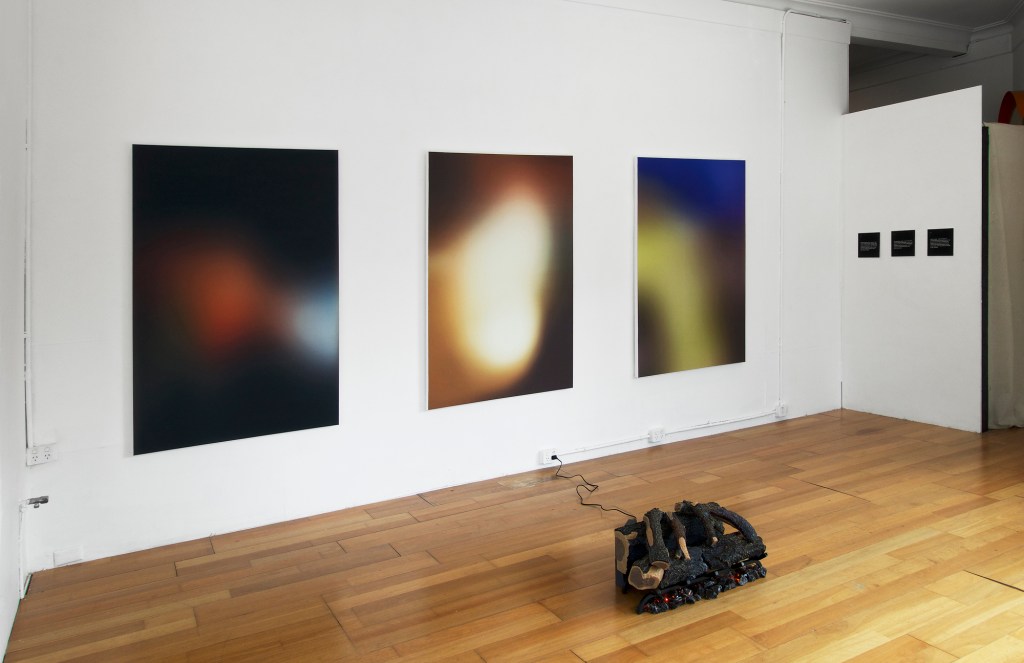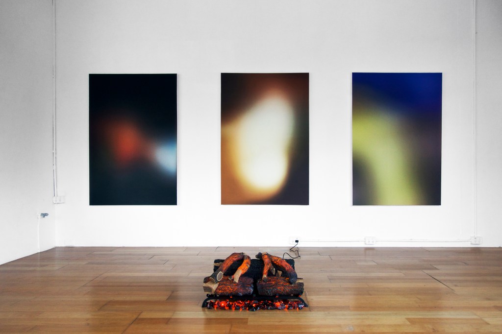 3 wall-mounted pedagogical panels intimately describe contemporary war crimes and atrocities. The 3 large printed/painted panels relate to these specific descriptions albeit in abstracted form: proportional with the iphone screen, each of these panels is a blurred representation of the corresponding image described on the wall texts as it attempts to load on screen. The barrage of accessible reportage of recent repeated Israel/US/Western breaches of international law is so voluminous it is impossible to represent adequately. As the endless stream of thousands of horrific online images struggles to be seen and comprehended, each fails in itself, to attest to undeniable evidence of the greater collapse of Western hegemony, a fact that could also be celebrated. The image becomes an approximation of this fall as we attempt to fully grasp its global implications. The pulsing electric fire, also an abstraction and synthetic approximation, speaks both to the comfort victims and witnesses seek in justice, and to the decimating impact of fire and the intentional destruction of infrastructure. If we are fatigued by museums, it is because they routinely fail to show or respond to, the most impactful events of our times.