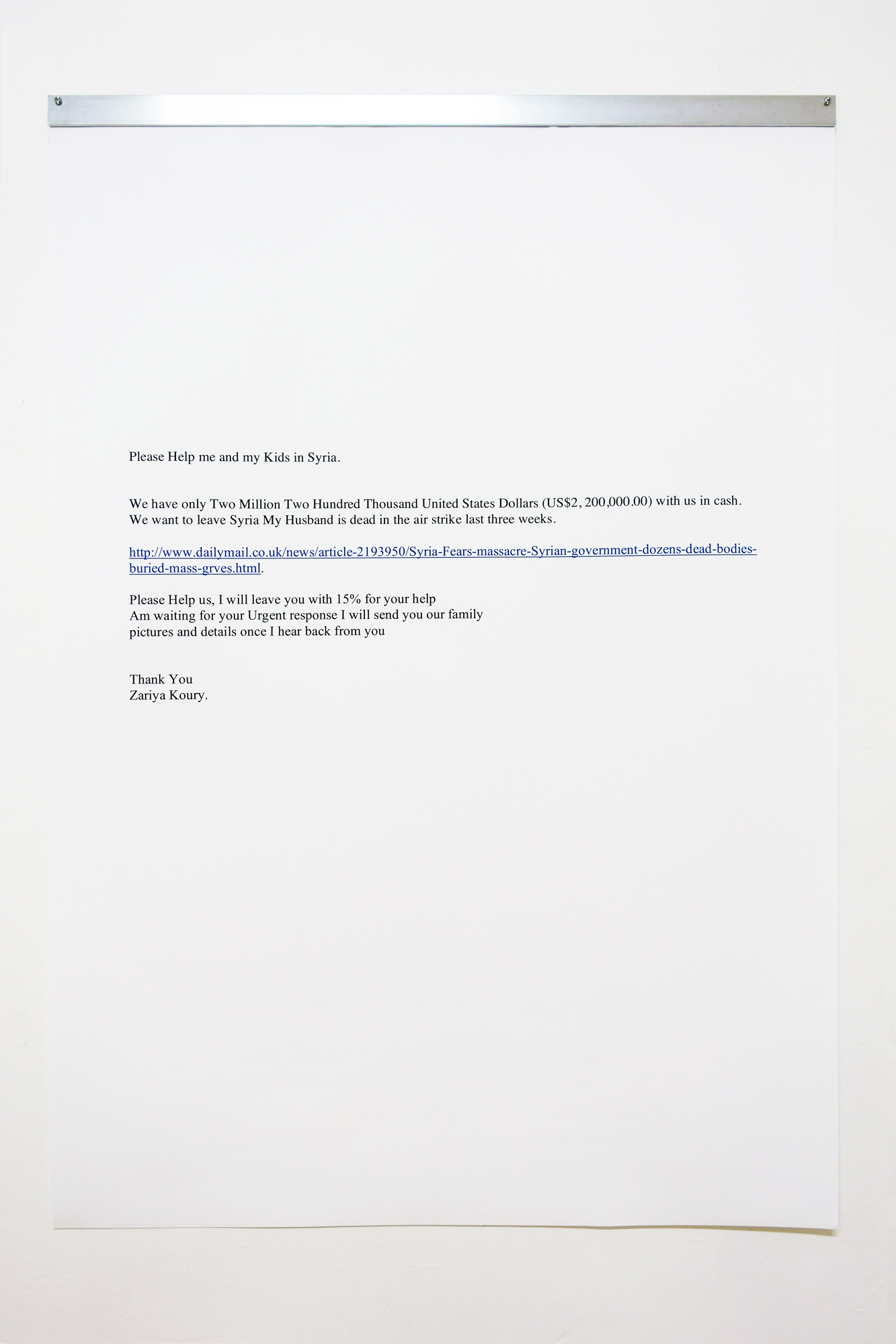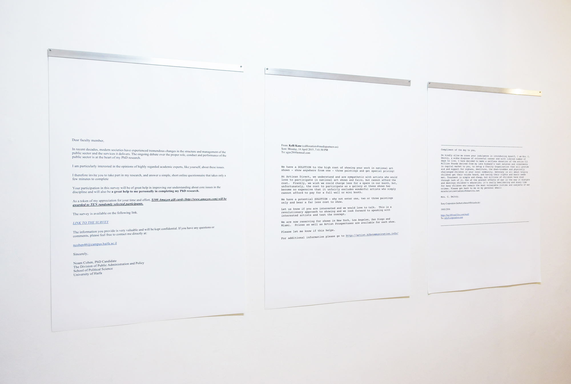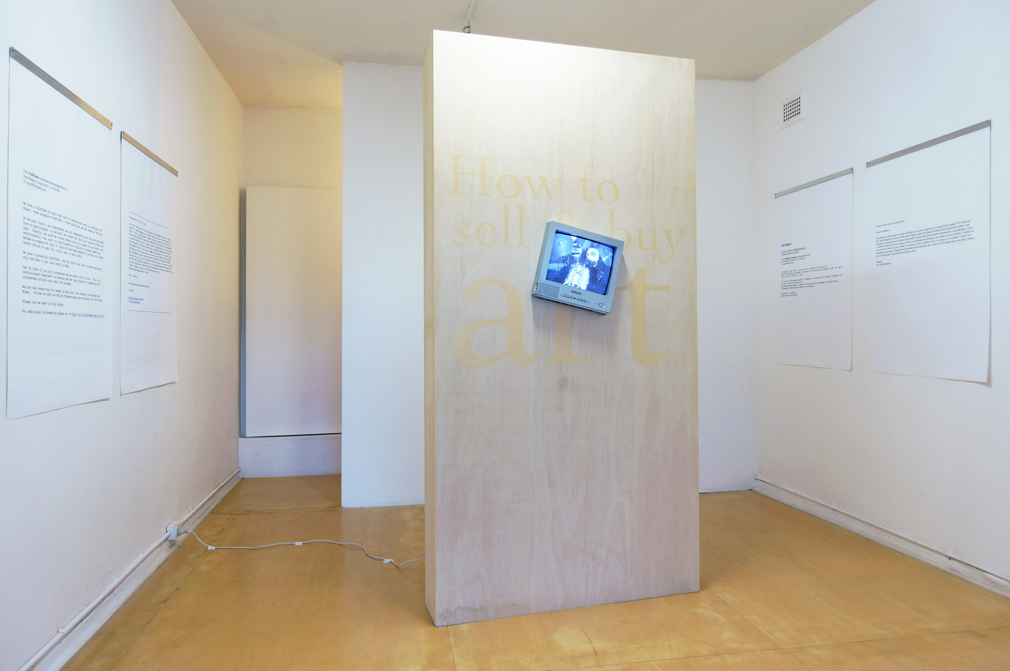 This installation brought together a range of disparate, though ultimately strangely interconnected references. The central freestanding object, specifically constructed of the same timber as the floor, was scaled to suggest the eerie ‘unexplainable’ monolith of Stanley Kunbrick’s 2001 (1968). At the same time it riffed off a matter-of-fact manual for buying and selling contemporary art. Flanking the object were enlarged prints of spam emails claiming to offer monetary or other rewards, including increased access to exhibiting internationally. For the ‘right’ price that is. Collectively evident in these emails was a dually reflected sense of base avarice, aimed at the gullible, and a global terrain of suffering. The art world, at least in its thoroughly monetised guise, promises riches and a haven from such tragedy. Spam emails offer instant millions for those willing to do the unknown sender a ‘favour’.